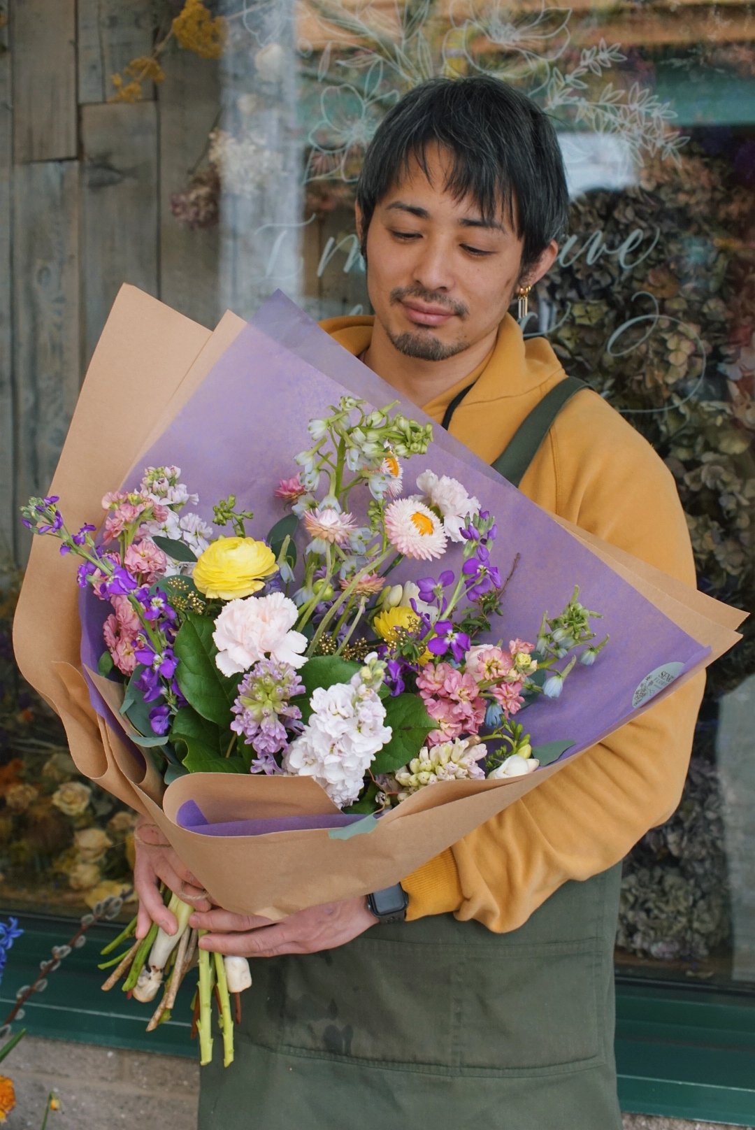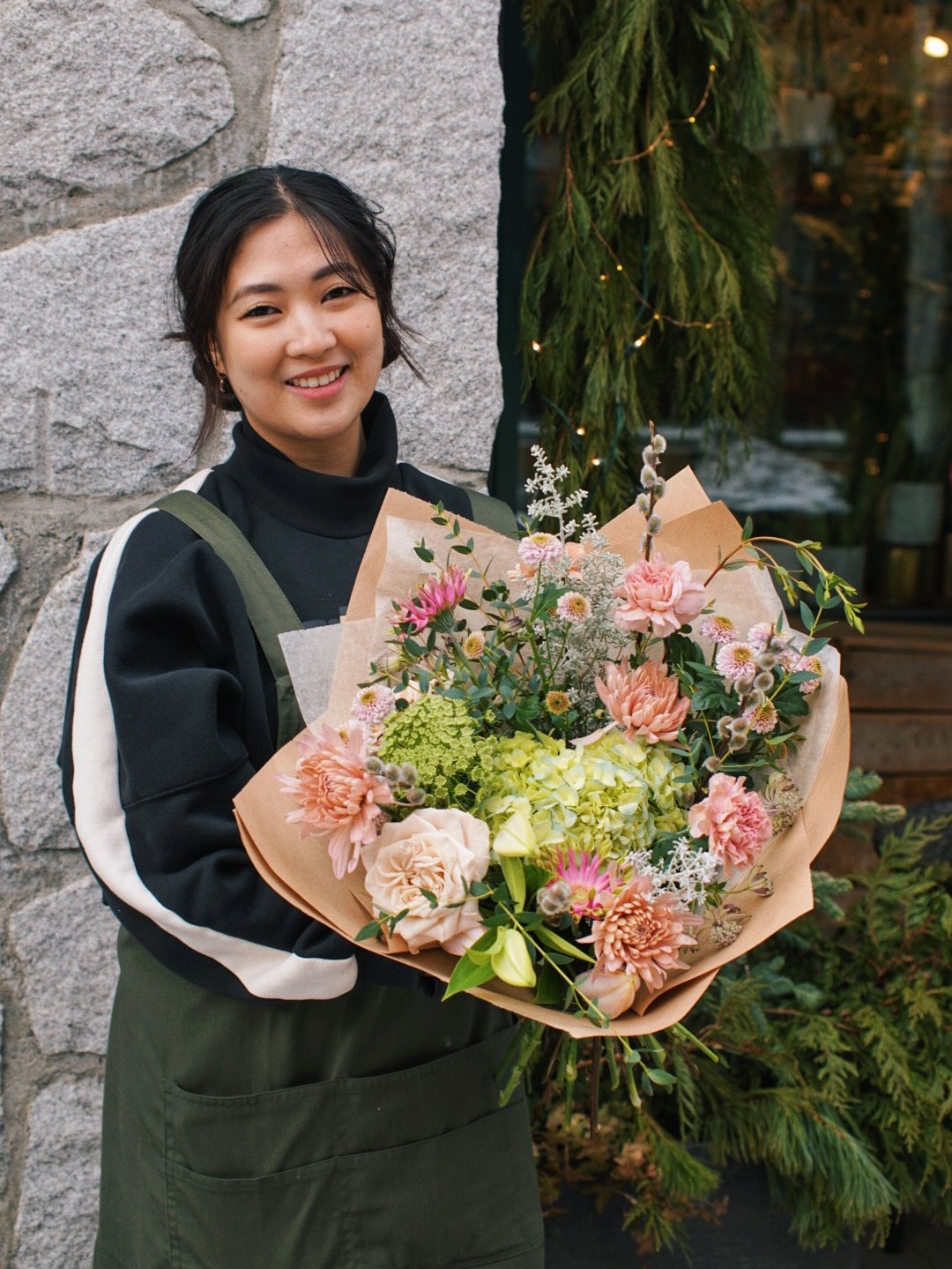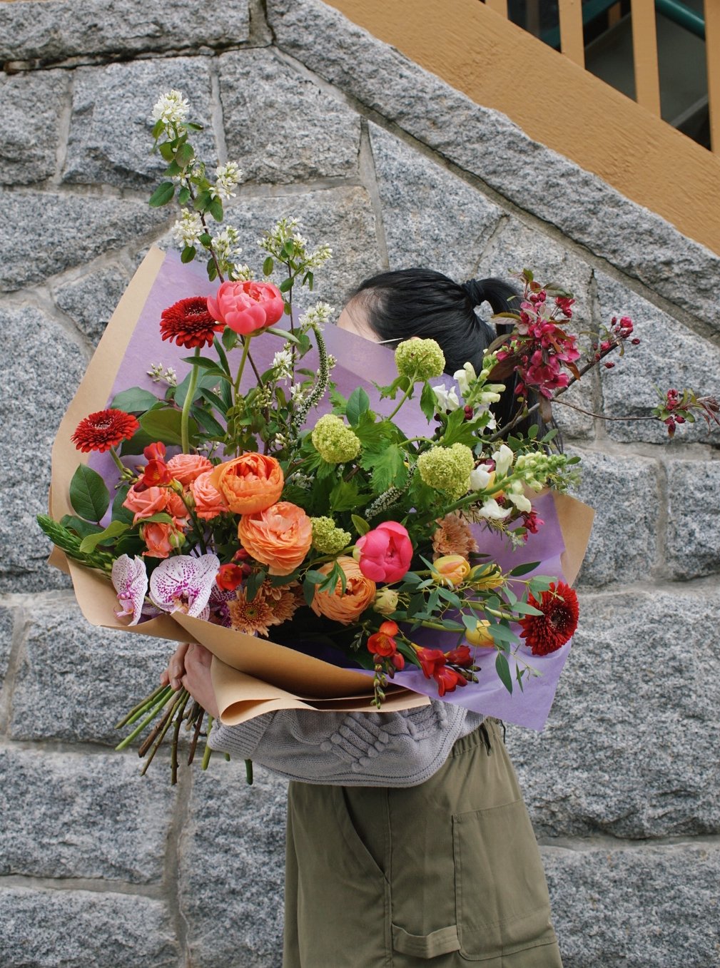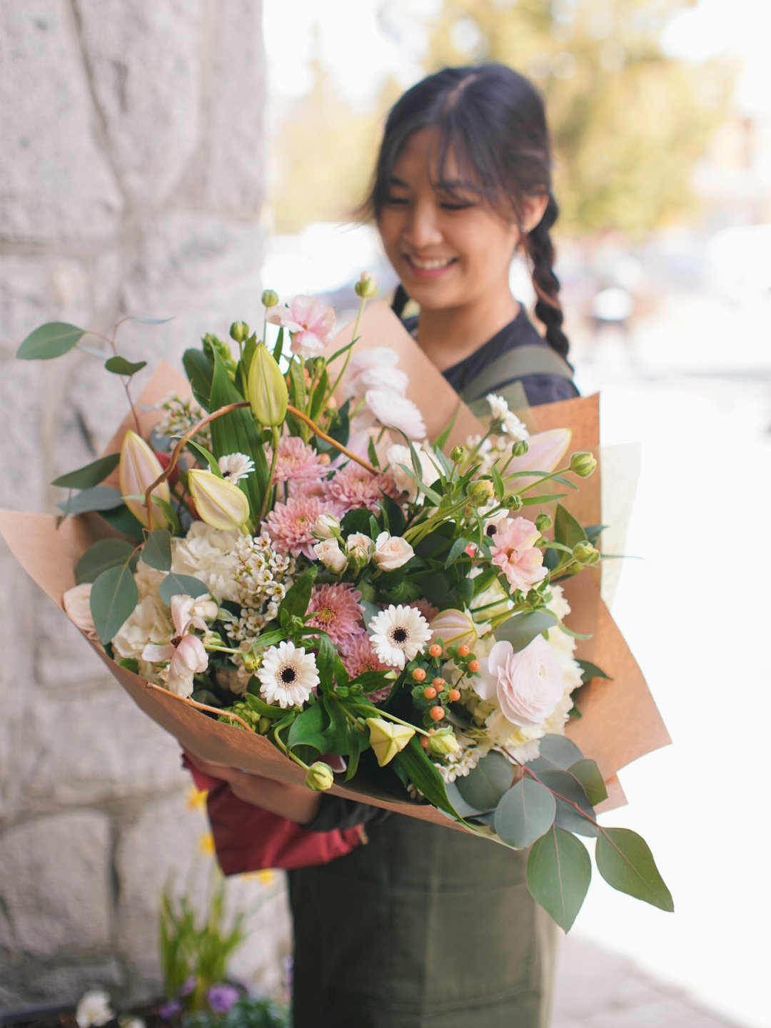 Each bouquet is custom-made by our designers with fresh seasonal flowers and greenery to suit your occasion and budget. It comes gift-wrapped in our signature brown paper.