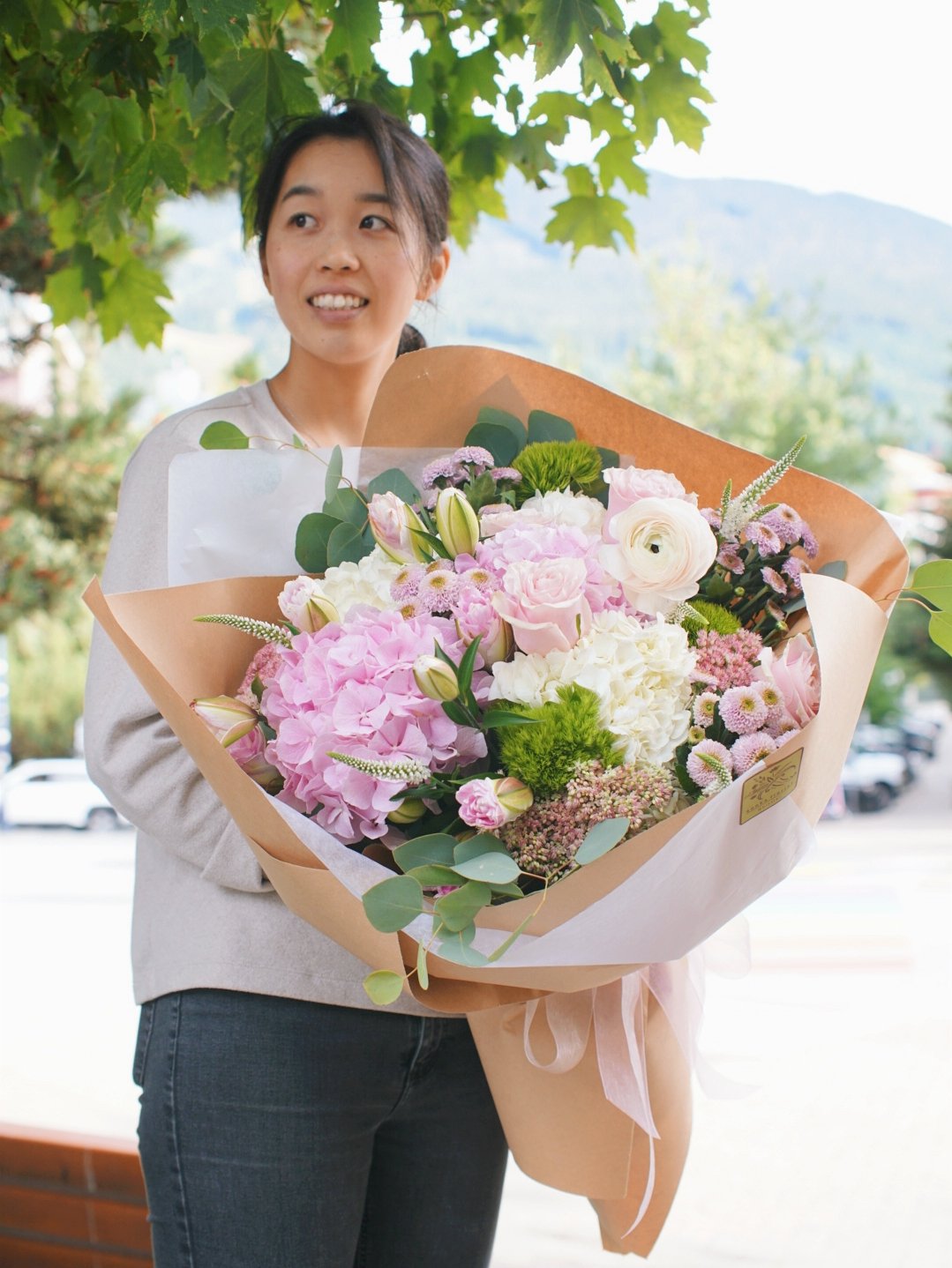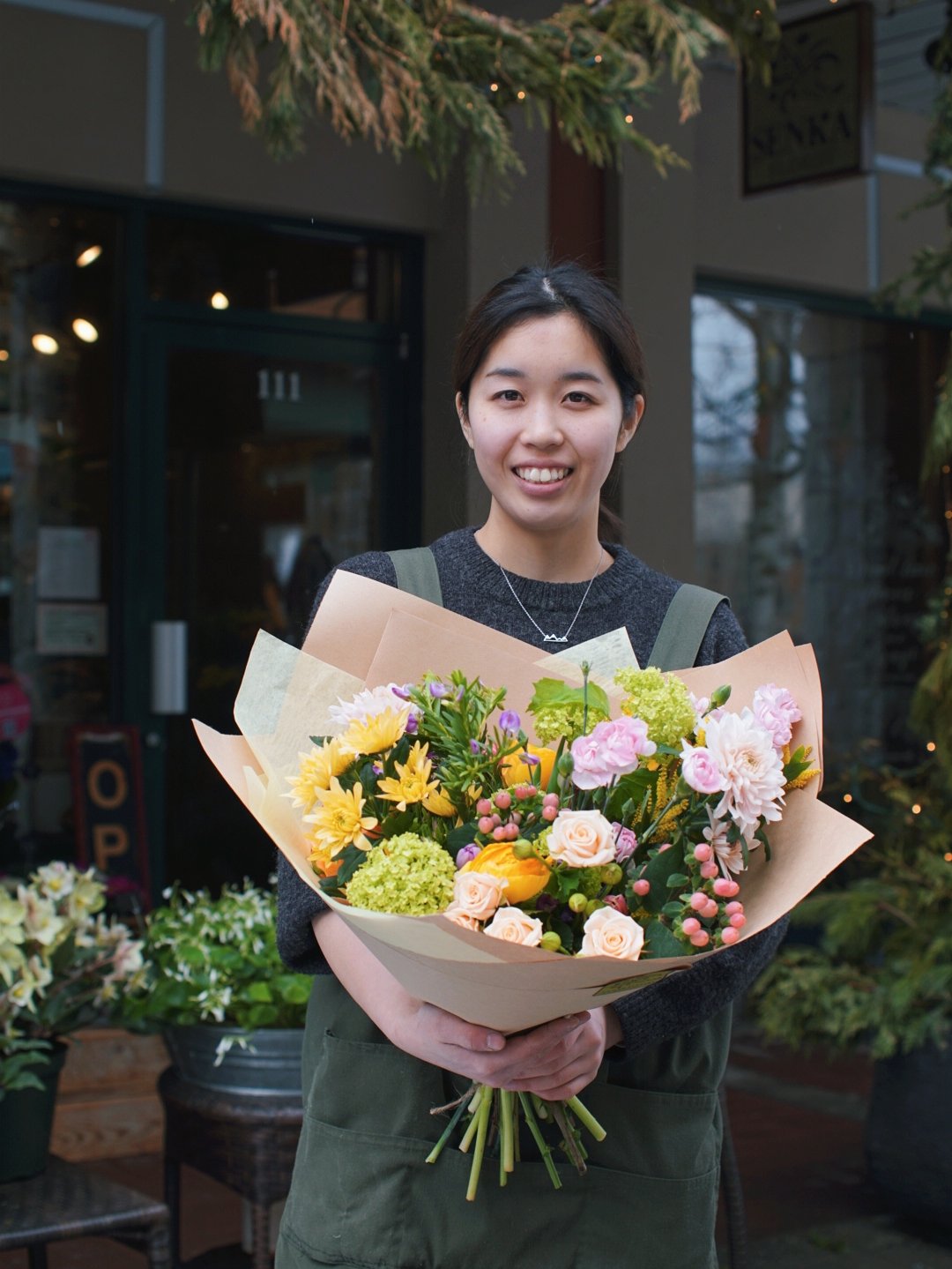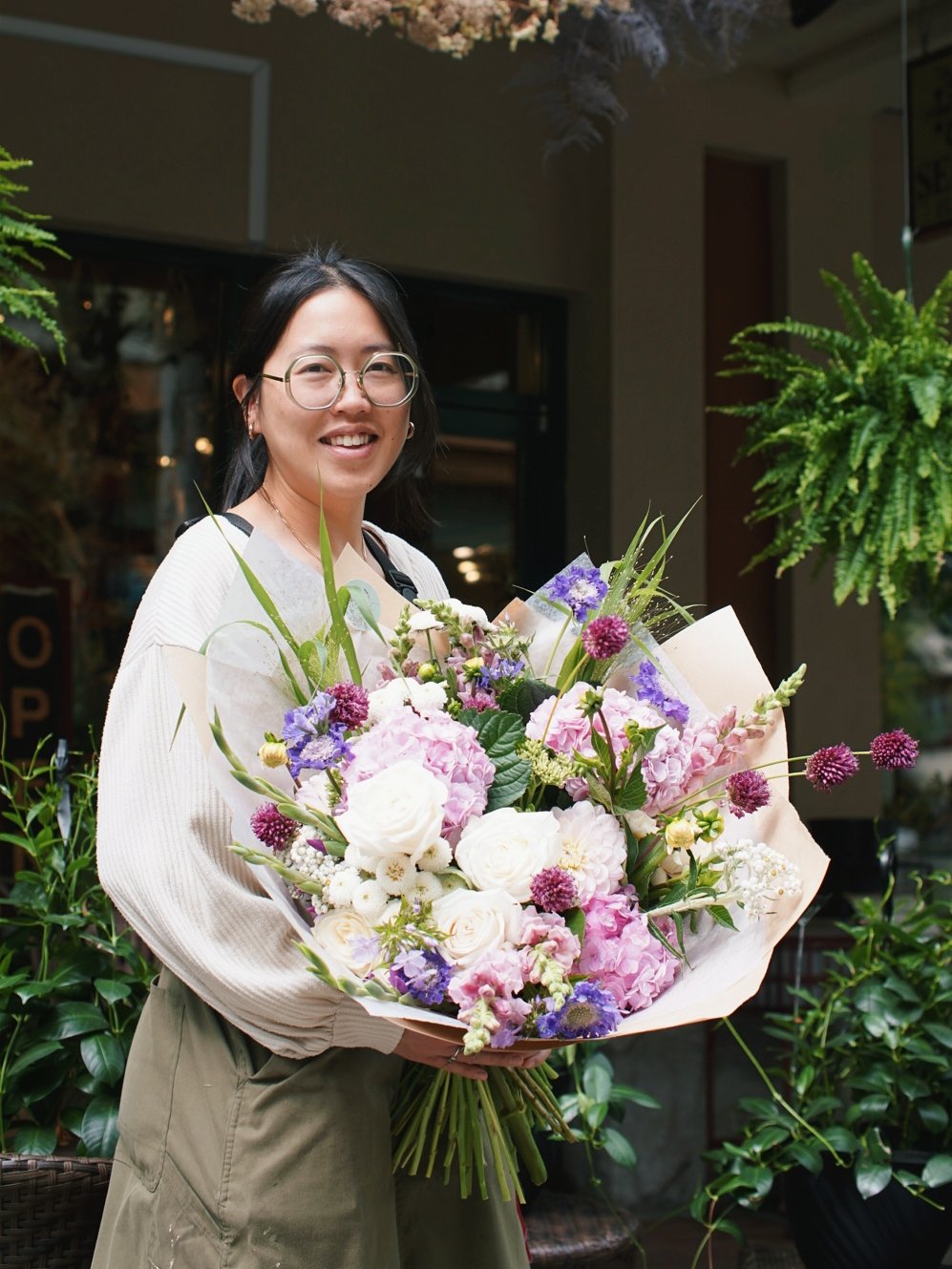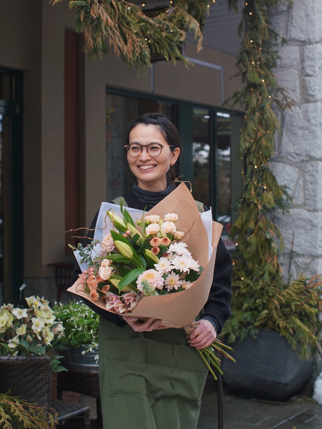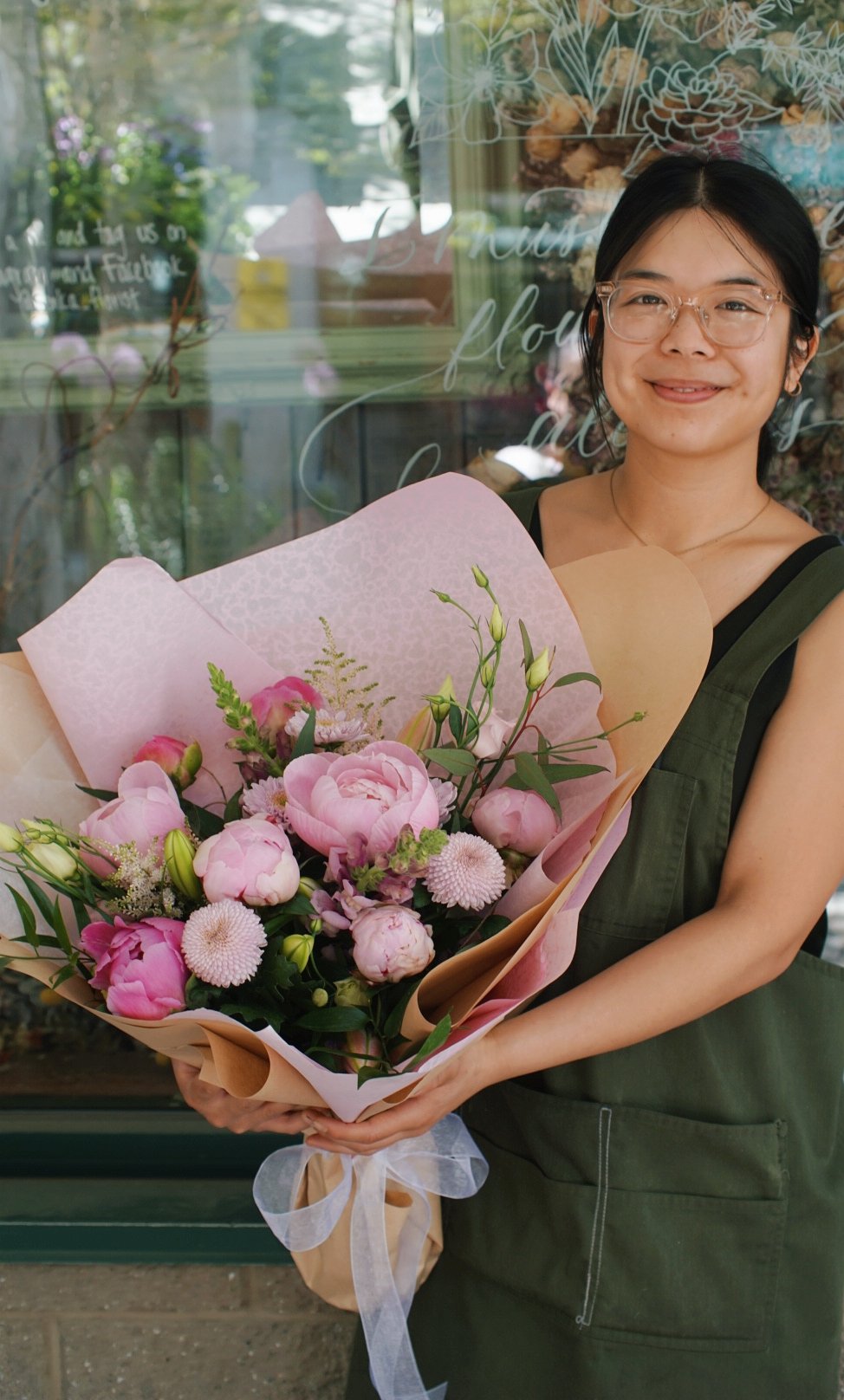 Each bouquet is custom-made by our designers with fresh seasonal flowers and greenery to suit your occasion and budget. It comes gift-wrapped in our signature brown paper.