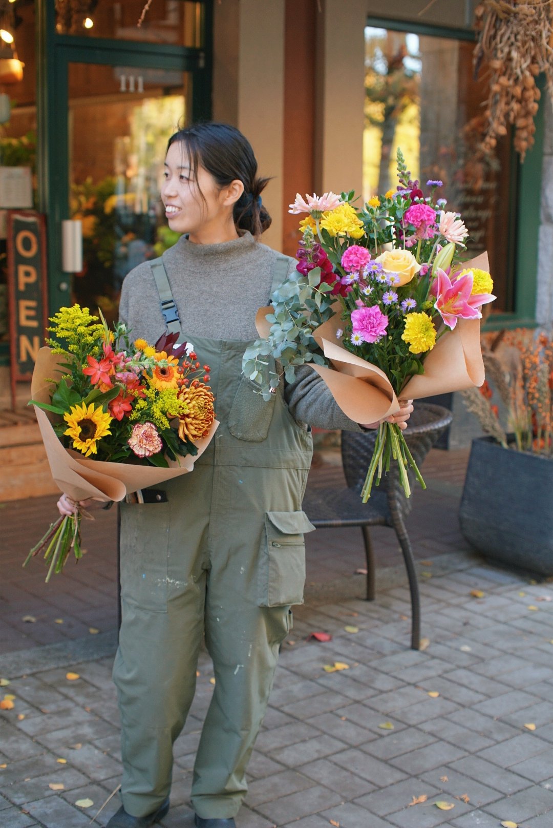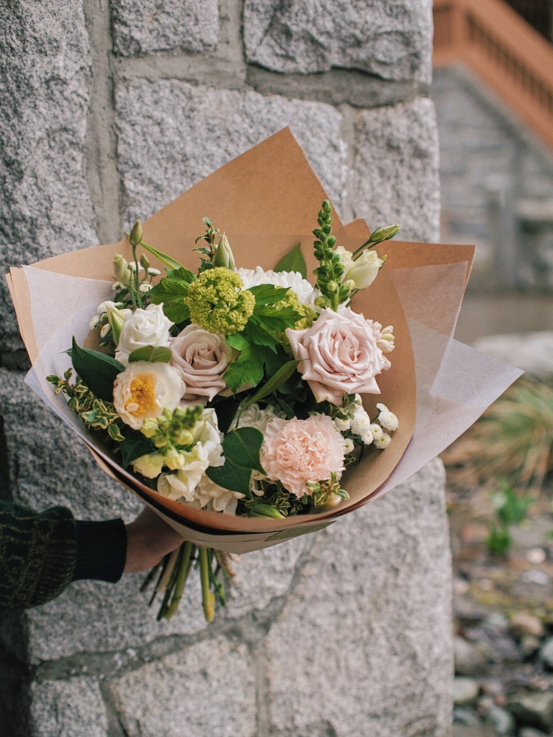 Each bouquet is custom made by our designers with fresh seasonal flowers and greenery to suit your occasion and gift wrapped in our signature brown paper.